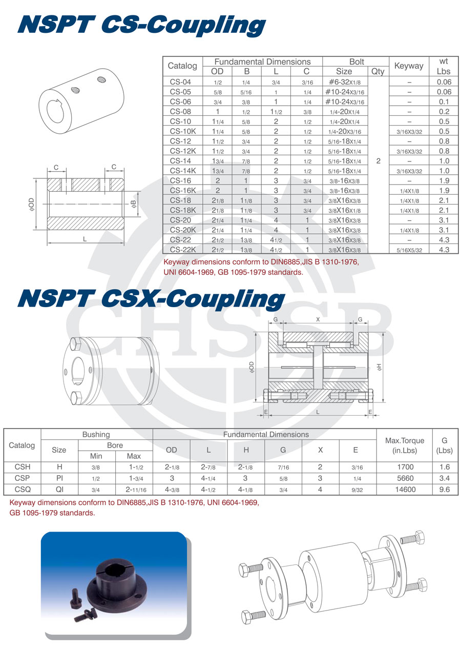 產(chǎn)品范圍: 美標(biāo)/歐標(biāo):(CSH/CSP/CSQ) 英制尺寸產(chǎn)品(適用于美標(biāo)市場) 公制尺寸產(chǎn)品(適用于歐標(biāo)市場) CSX型聯(lián)軸器 CSH型聯(lián)軸器 CSP型聯(lián)軸器 CSQ型聯(lián)軸器