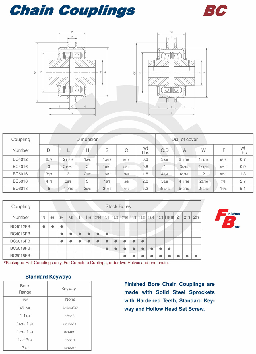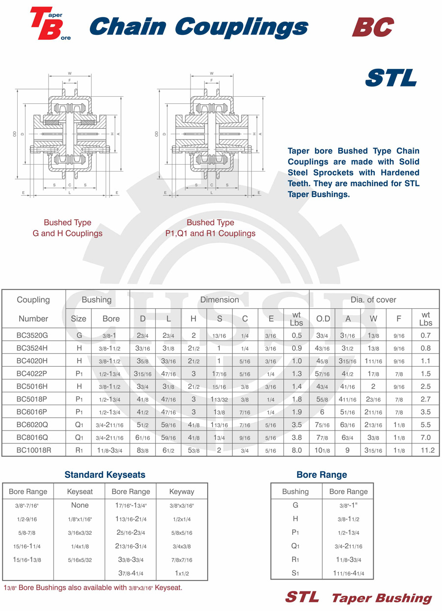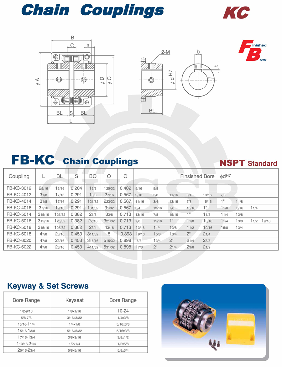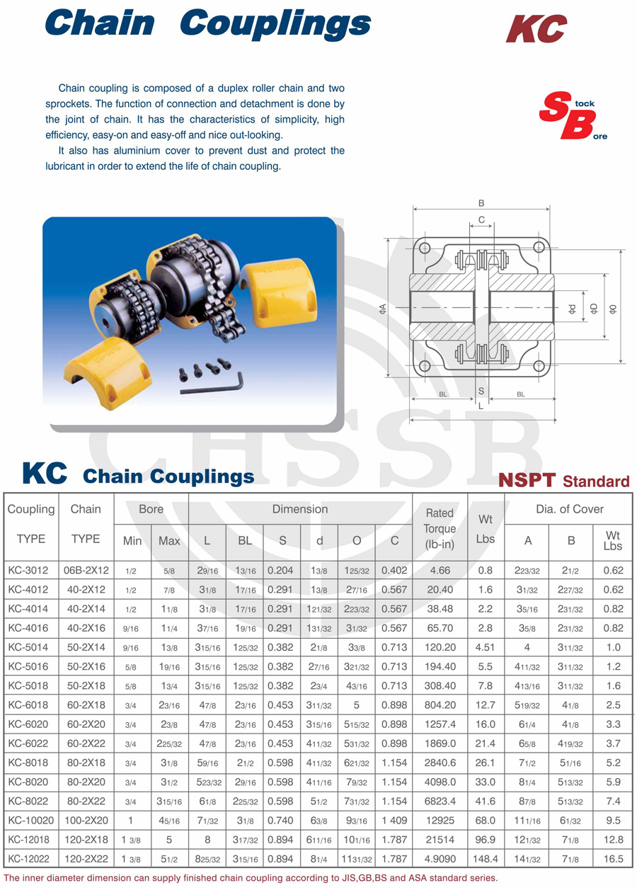 產品范圍: 美標:(SB-KC/FB-KC/FB-MC/BTL-MC/QTL-MC/FB-BC/STL-BC) 歐標:(KC) 英制尺寸產品(適用于美標市場) 公制尺寸產品(適用于歐標市場) KC鏈條聯軸器
